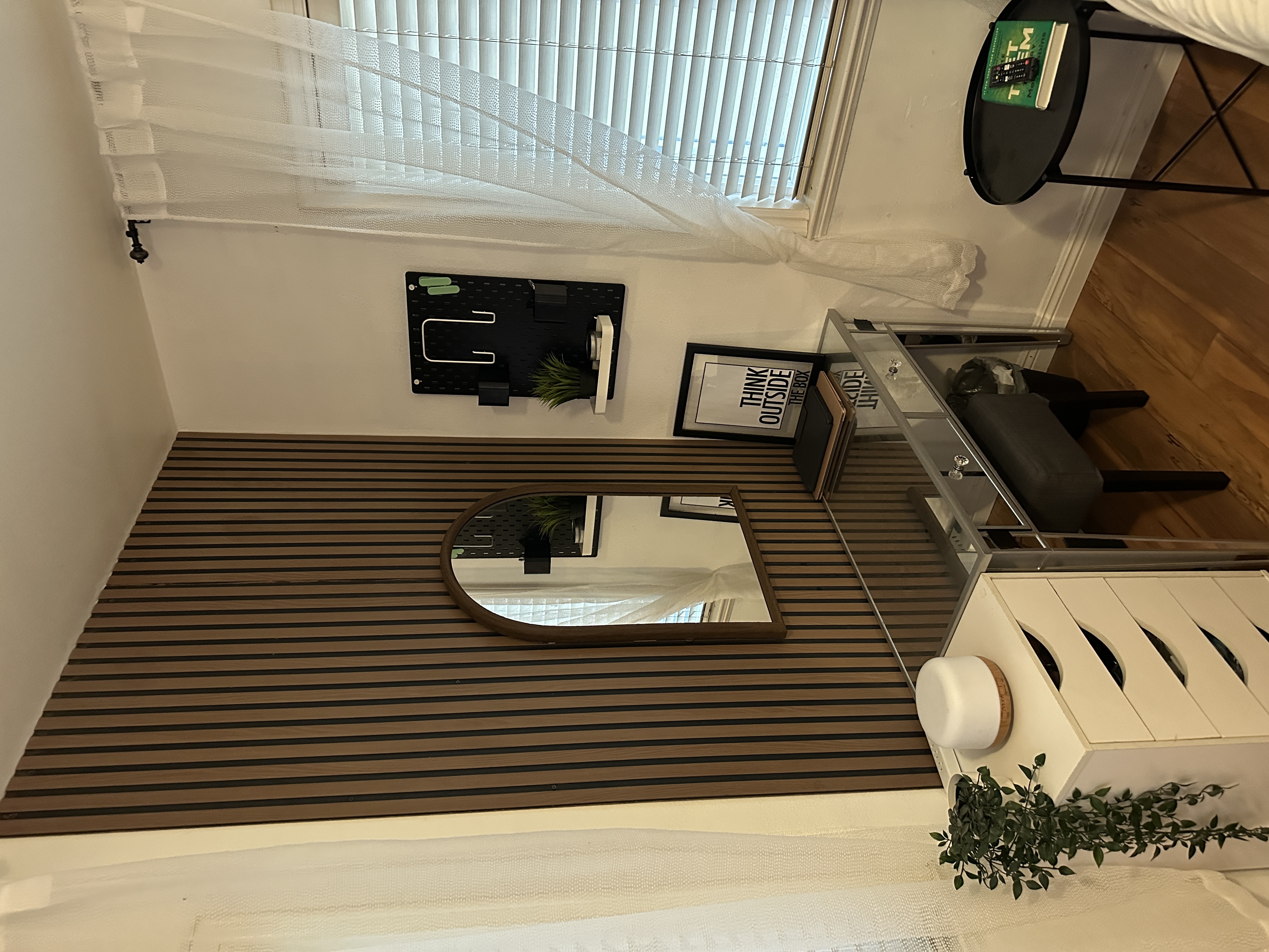 I mounted the panels using black drywall screws for a subtle contrast and added a pegboard so she could store her laptop and accessories without cluttering the desk.